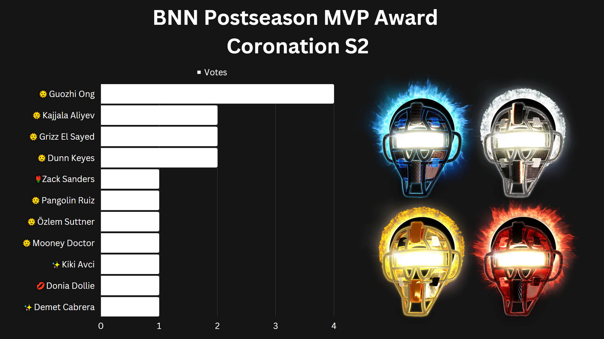 As expected, the champion Sunbeams nearly swept the voting for Postseason MVP, with tide-turning grand slammer Guozhi Ong earning the most votes to claim the trophy. However, the award could have gone to any number of Beams, including Grizz El Sayed and Kajjala Aliyev for countless clutch hits, Dunn Keyes for a great performance on the mound in the final game, or any of the other Moab Hellmouth players listed in the chart above.